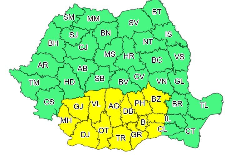 Administrația Națională de Meteorologie a actualizat avertizările cod galben de vreme severă. Alertele meteo vizează ploi și vânt puternic în sud și sud-est. La munte, meteorologii anunță ninsori și viscol.