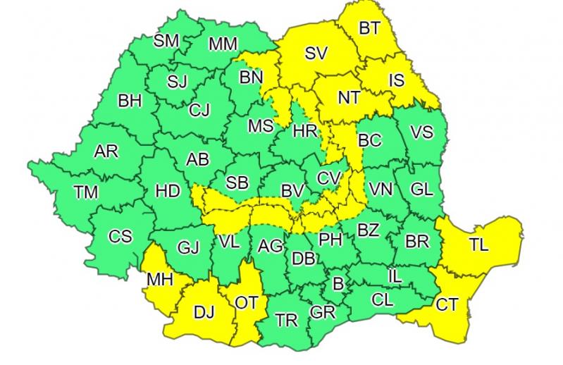 Un al doilea cod galben, pentru 21 noiembrie, ora 5.00 – 21 noiembrie, ora 18.00, vizează ninsori moderate cantitativ. Local la altitudini în general de peste 1500 m în Carpații Meridionali, precum și în Carpații Orientali și în jumătatea nordică a Moldovei va ninge moderat cantitativ și se va depune strat nou de zăpadă, pe alocuri în jurul a 10 cm. În zona deluroasă și montană a Moldovei, precum și în Carpații de Curbură trecător vor fi și precipitații mixte și izolat se va depune polei, potrivit ANM.