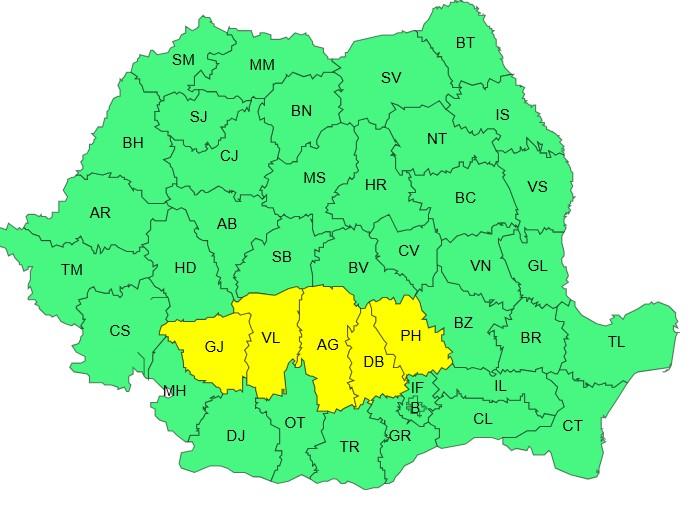 În intervalul vineri, ora 10.00 - sâmbătă, ora 8.00, în nordul Olteniei și al Munteniei vor fi averse însemnate cantitativ, iar în timp scurt sau prin acumulare cantitățile de apă vor fi de 25...50 l/mp.