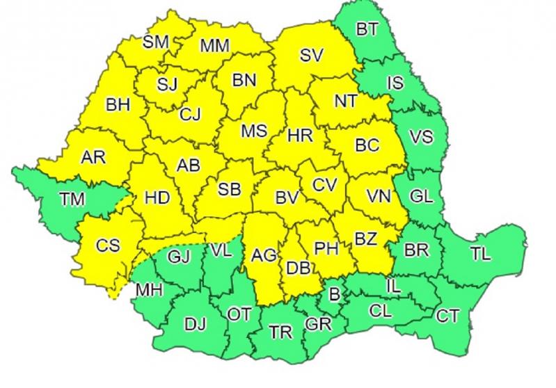 Alerta vizează județele: Satu Mare, Maramureș, Sălaj, Suceava, Bistrița-Năsăud, Neamț, Harghita, Mureș, Brașov, Covasna, Prahova, Dâmbovița, Argeș, Vâlcea, Mehedinți, Gorj, Sibiu, Alba, Cluj, Bihor, Arad, Timiș, Caraș Severin, Hunedoara, Bacău, Vrancea și Buzău.