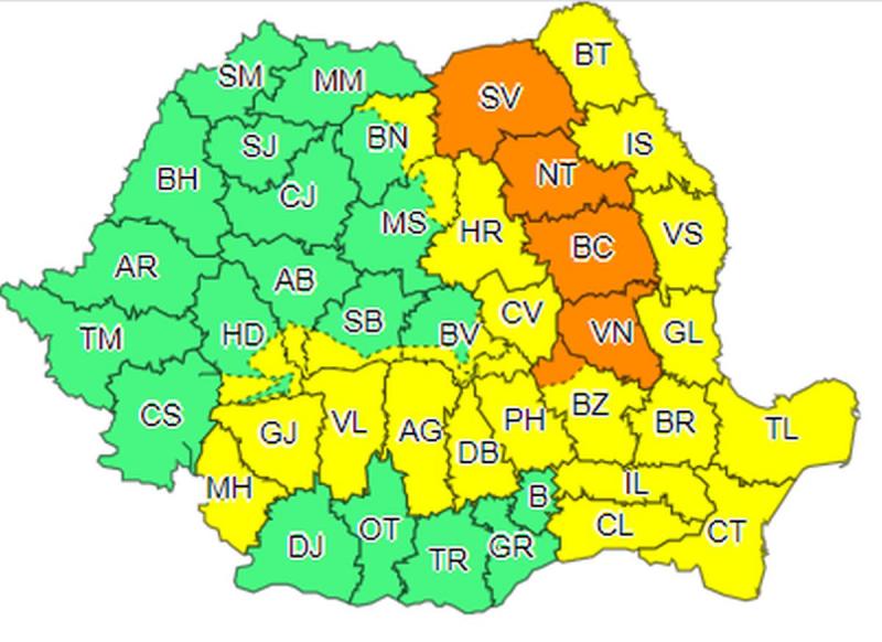 De sâmbătă, de la ora 23.00, până duminică, la aceeaşi oră, va fi în vigoare un alt Cod portocaliu. În judeţele Suceava, Neamţ, Bacău, Vrancea şi zona de munte a judeţului Buzău va ploua abundent şi se vor acumula cantităţi de apă de 40-50 litri/ metru pătrat şi izolat 60-70 litri/ metru pătrat.