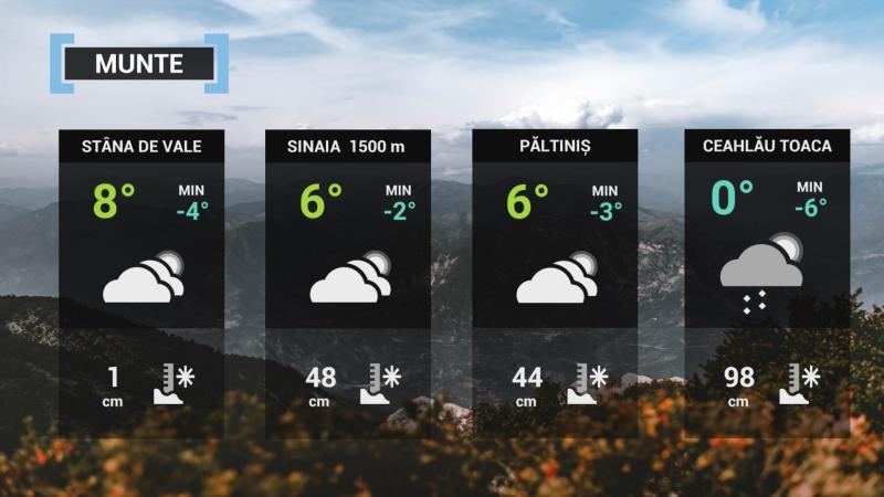 La munte se vor semnala precipitații slabe mixte, izolat, în nordul Carpaților Orientali. În rest cerul va fi temporar noros ziua și variabil noaptea. Vântul va sufla slab, cu intensificări în zonele înalte, iar vremea va fi în general răcoroasă.