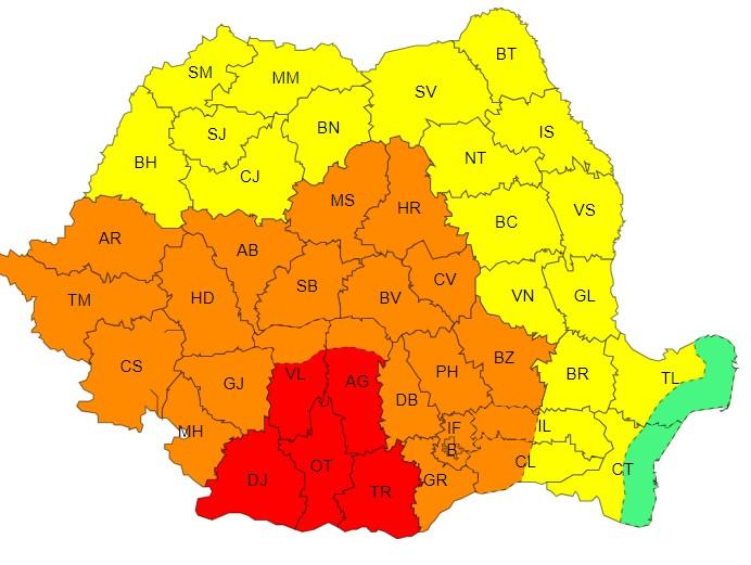 În prima zi de weekend 5 judeţe din sud se vor afla sub cod roşu de caniculă. Potrivit ANM, în Dolj, Olt, Teleorman și sudul județelor Vâlcea și Argeș, valul de căldură va fi intens și persistent, iar temperaturile vor fi deosebit de ridicate, pentru a patra zi consecutiv. Temperaturile maxime vor fi de 38...39 de grade, iar cele minie, se vor situa în jurul a 20 de grade (nopți tropicale). Va fi caniculă și disconfort termic deosebit de accentuat, iar indicele temperatură-umezeală (ITU) va depăși pragul critic de 80 de unități. Sâmbătă, valul de căldură va persista și se va intensifica ușor în Banat, sudul Crișanei, cea mai mare parte a Transilvaniei și local în Oltenia și Muntenia, unde se vor înregistra temperaturi cu mult mai ridicate pentru această dată.