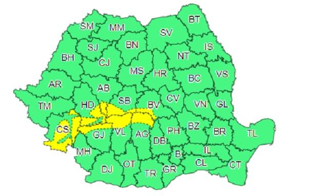 Zonele vizate de prima avertizare Cod galben sunt în judeţele: Sibiu, Braşov, Argeş, Vâlcea, Gorj, Caraş-Severin, Alba şi Hunedoara.