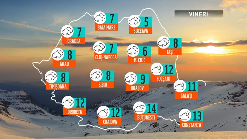 Regimul termic va cuprinde valori cu 10 grade peste normalul perioadei. Astfel, temperaturile maxime se vor încadra între 6 şi 15 grade, cu cele mai ridicate valori în sud-vest.
