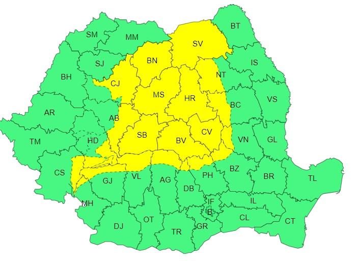 O altă avertizare cod galben vizează intervalul 12 februarie, ora 18.00 – 13 februarie, ora 22.00. În cea mai mare parte a Transilvaniei și în nord-vestul Moldovei, precum și în zonele montane aferente va ploua și se vor acumula cantități de apă de 25...30 l/mp, iar izolat de 50 l/mp. La altitudini mai mari de 1500 m, îndeosebi pe parcursul zilei de marți (13 februarie) în Carpații Orientali și în Carpații Meridionali vor predomina ninsorile și se va depune strat de zăpadă, local consistent.
