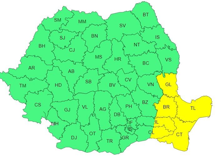 Vor fi viteze în general de 55-65 km/h, iar în judeţul Constanţa şi pe litoral, rafalele vor depăşi temporar 70 km/h. Sunt vizate de atenţionare judeţele Galaţi, Brăila, Tulcea, Constanţa şi, parţial, Ialomiţa şi Călăraşi. Pe litoral vântul va continua să prezinte intensificări în prima parte a nopţii de luni spre marţi, cu viteze de 50-55 km/h.