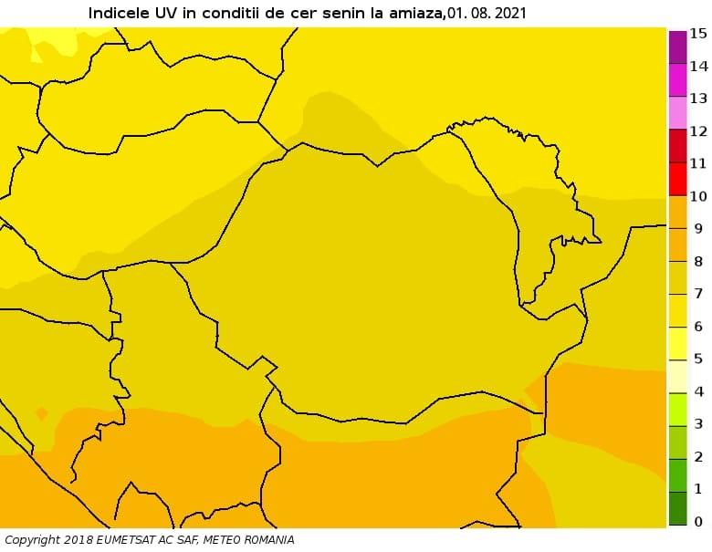 Pentru astăzi (1 august) în zona de sud-est a ţării, valoarea pentru indicele UV va atinge 9 - 10 unităţi. În zona litoralui radiaţiile ultaviolete pot fi amplificate atât de apa mării cât şi de nisip, ambele având un albedo ridicat. Este recomandat ca în intervalul orar 11 - 16 să evitam ieşirile în aer liber şi expunerile prelungite la soare.