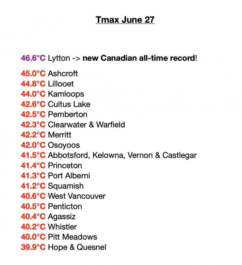 Val de căldură fără precedent în Canada. S-au înregistrat 46,6 grade Celsius, la umbră în Lytton's. Un record termic absolut pentru zona respectivă. Anterioriorul record era de 45 grade și fusese atins în data de 5 iulie 1937.