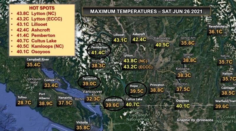 Tot în zona orașului Lytton din Columbia Britanică, cu o zi înainte temperatura maximă atingea o valoare de 43,8 grade Celsius.