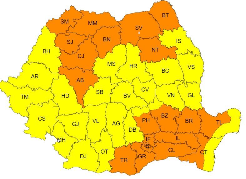 Harta județelor afectate de codurile galben și portocaliu de vreme severă