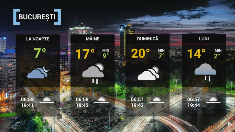 La noapte, cerul va fi variabil în prima parte a nopţii, apoi se va înnora treptat, iar vântul va sufla slab pânã la moderat. Temperatura minimã va fi de 5...7 grade.