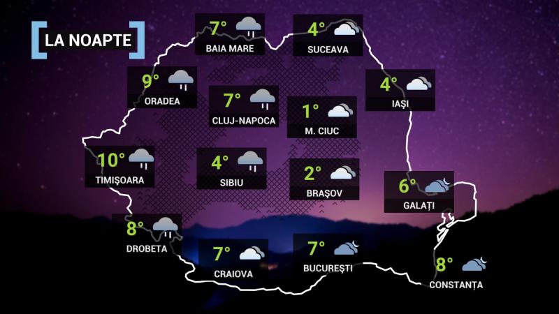 La noapte, cerul se va înnora treptat în mare parte din ţarã şi va ploua, mai ales sub formã de aversã în Banat, Crişana, Maramureş şi în zonele montane aferente - unde izolat cantitãţile de apã vor putea depãşi 10 l/mp. Pe alocuri ploi slabe vor fi şi în Transilvania, Oltenia, nord-vestul Munteniei şi nordul Moldovei, iar pe crestele montane se vor semnala şi precipitaţii sub formã de lapoviţã sau ninsoare. Vântul va sufla slab şi moderat. Temperaturile minime vor fi cuprinse între 1 şi 11 grade. Izolat se va forma ceaţã.