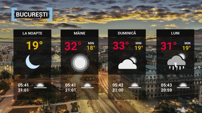 La noapte, cerul va fi mai mult senin, iar vântul va sufla în general slab. Temperatura minimã va fi de 18...19 grade.