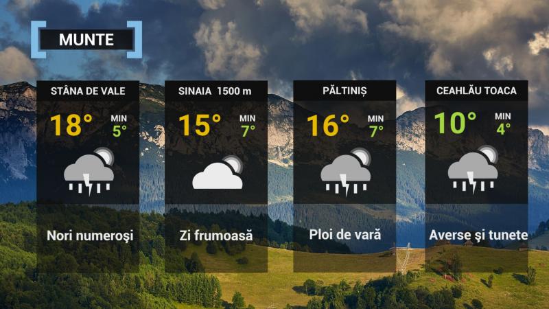 Ploile vor avea şi caracter torenţial, iar pe alocuri, mai ales în sud şi la munte, cantităţile de apă vor depăşi 25...35 l/mp. Izolat va cădea grindină, iar mai ales în timpul ploilor vor fi intensificări ale vântului (viteze la rafală, în general, de 45...60 km/h) şi vijelii. Temperaturile maxime se vor încadra între 21 şi 29 de grade, iar cele minime între 9 şi 18 grade. Dimineaţa şi noaptea, izolat, se va semnala ceaţă. Presiunea atmosferică se va menţine la valori joase, de regim baric slab ciclonic.