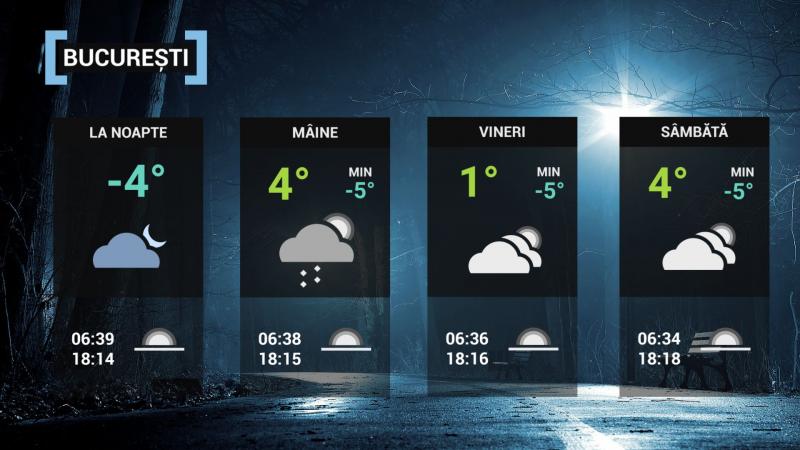 La noapte, vremea va fi rece pentru această dată. Cerul va fi variabil, iar vântul va sufla slab şi moderat. Temperatura minimă va fi de -5...-4 grade, mai scăzută în zona periurbană spre -8 grade.