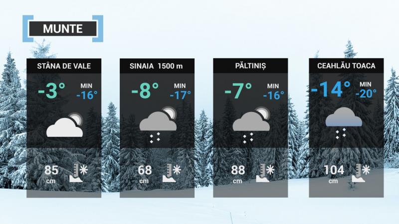 Vremea va fi deosebit de rece, geroasă dimineaţa îndeosebi în depresiunile intramontane, iar noaptea în centrul, nordul şi nord-estul ţării şi pe arii mai restrânse în rest. Temperaturile maxime se vor încadra, în general, între -3 şi 5 grade, iar cele minime vor fi cuprinse între -13 şi -3 grade, mai coborâte în depresiunile din estul Transilvaniei spre -18 grade.