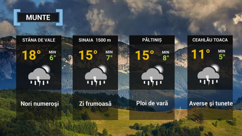 Vremea se va menţine în general instabilă. Cerul va fi variabil, cu înnorări temporar accentuate, mai ales după-amiaza şi seara, când se vor semnala averse şi descărcări electrice în zonele de deal şi munte, local în sud, centru, est şi nord-est şi doar pe arii restrânse în rest.