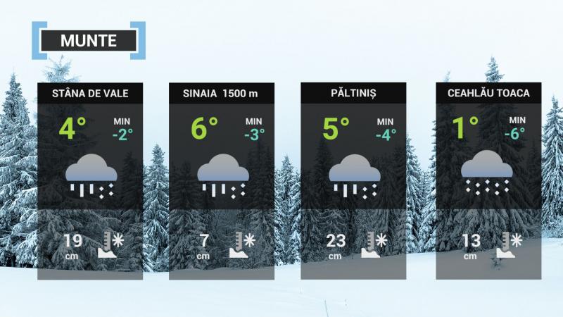 Cerul va fi mai mult noros şi se vor semnala precipitaţii mixte, iar la altitudini de peste 1700 m va continua să ningă şi să se depună strat de zăpadă. Pe arii restrânse se vor mai acumula cantităţi de apă în general de 15...25 l/mp. Vântul va avea intensificări îndeosebi pe creste, mai ales în prima parte a intervalului, cu rafale de peste 80...100 km/h, viscolind ninsoarea şi spulberând zăpada. Valorile termice se vor menţine mai ridicate decât cele specifice perioadei. Vor fi condiţii de formare a poleiului sau a gheţuşului.