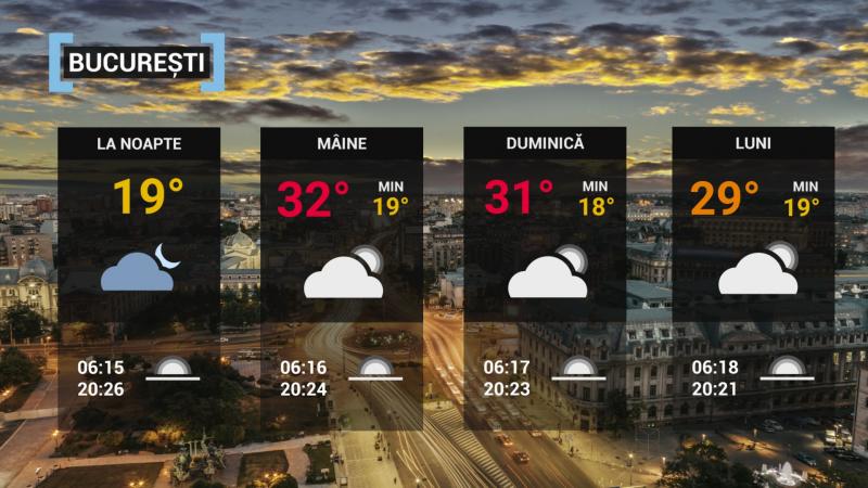 Vremea va fi în general instabilã. Cerul va fi variabil, cu înnorãri temporar accentuate, averse şi descãrcãri electrice în zonele montane, în sud-vest şi nord-est, local în centru şi pe arii mai restrânse în restul ţãrii. Pe alocuri vor fi cantitãţi de apã însemnate şi condiţii de grindinã. Vântul va sufla slab şi moderat, cu intensificãri de scurtã duratã, mai ales în timpul ploilor. Temperaturile maxime se vor încadra între 22 şi 33 de grade, iar cele minime vor fi cuprinse în general între 12 şi 21 de grade.