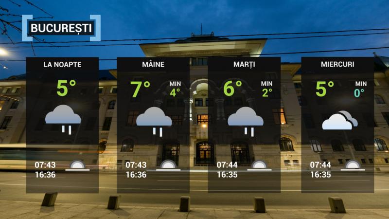 La noapte, cerul va fi mai mult noros şi trecător, cu probabilitate mai mare în a doua parte a nopţii, va ploua slab. Vântul va sufla slab până la moderat. Temperatura minimă va fi de 4...5 grade.