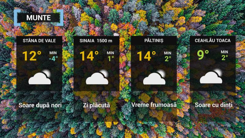Vremea va frumoasă în continuare, cu cer variabil şi pe spaţii mici, pe văi şi în depresiuni, vor fi condiţii de ceaţă dimineaţa şi noaptea. Vântul va sufla slab şi moderat, cu uşoare intensificări mai ales pe creste. Valorile termice vor fi în scădere uşoară mai ales la valorile nocturne.