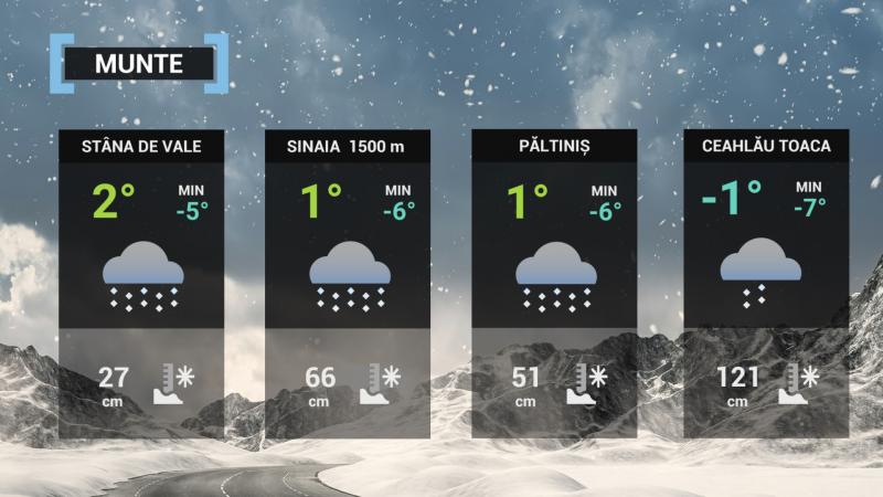 În cursul nopţii în Maramureş şi Transilvania vor fi perioade şi cu lapoviţă şi ninsoare, pe alocuri cu depunere de strat de zăpadă, dar trecător precipitaţii mixte se vor semnala şi în zonele deluroase din rest. Intensificări temporare ale vântului, cu viteze în general de 45...55 km/h vor fi în majoritatea zonelor, îndeosebi în sud şi sud-est, cu pânã la 60...65 km/h în Oltenia. Temperaturile maxime se vor încadra, în general, între 4 şi 13 grade, cu cele mai scăzute valori în dealurile vestice, iar cele minime vor fi cuprinse în marea lor majoritate între -2 şi 8 grade. Presiunea atmosferică va creşte în vestul, centrul şi sudul ţãrii.