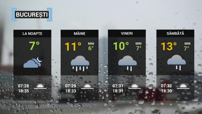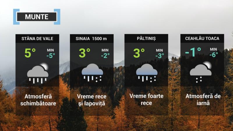 Vremea va fi deosebit de rece, cu valori termice chiar uşor mai scăzute decât în intervalul anterior. Cerul va fi noros în jumătatea de sud-est a ţării, unde temporar va ploua. Prin acumulare, cantităţile de apă vor depăşi local de 20...25 l/mp şi izolat 30 l/mp. În restul teritoriului înnorările vor fi temporare, iar ploile se vor semnala pe arii mai restrânse, cu precădere pe parcursul zilei. La munte vor fi precipitaţii mixte, iar la altitudini mari va ninge şi se va depune strat de zăpadă. Vântul va sufla slab şi moderat, cu unele intensificări seara şi noaptea în Dobrogea, cu viteze mai mari pe litoral. Temperaturile maxime se vor încadra între 7 şi 15 grade, iar cele minime, în general, între 0 şi 10 grade. Izolat îndeosebi în nord-vestul şi nordul teritoriului vor fi condiţii de ceaţă şi brumă. Presiunea atmosferică va creste dinspre vest, încât se va restabili regimul baric normal.
