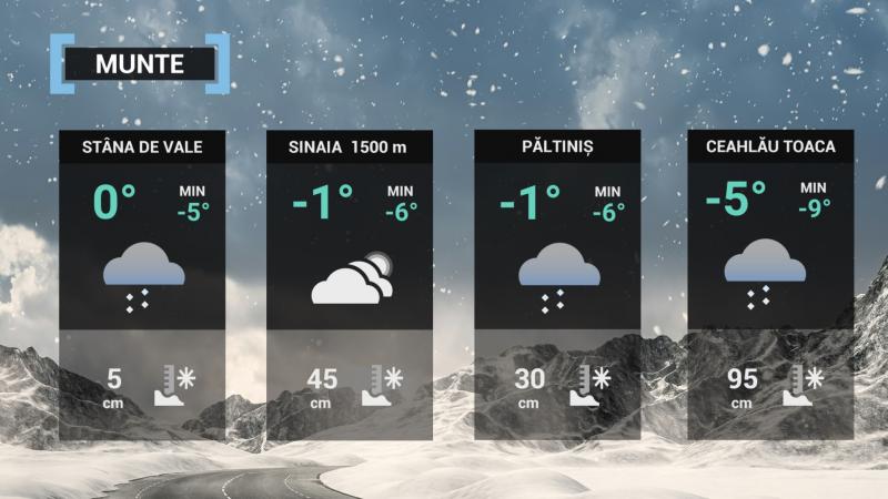 Vremea se va menţine deosebit de rece pentru mijlocul lunii aprilie. Nebulozitatea va fi persistentă, va ninge şi va continua sã se depună strat de zăpadă, iar la altitudini mari va fi viscol, în special în Carpaţii Meridionali şi de Curbură, unde se vor înregistra rafale de vânt de peste 70...80 km/h.