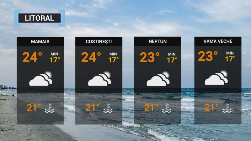 Vremea va fi caldã. Cerul va fi variabil, cu înnorări temporare ziua când, izolat vor fi condiţii pentru averse şi descărcări electrice. Vântul va sufla slab şi moderat cu uşoare intensificări pe coastă. Temperaturile maxime se vor situa între 22 şi 25 de grade, iar cele minime între 16 şi 19 grade. Temperatura apei mării va fi de 19...21 de grade.