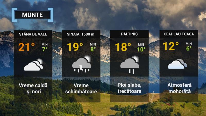 Valorile termice se vor menţine peste cele specifice perioadei în majoritatea masivelor. Cerul va fi variabil, cu înnorări temporar accentuate după-amiaza şi seara, când se vor semnala averse şi trecător descărcări electrice, local în Carpaţii Meridionali şi în Carpaţii de Curbură şi cu totul izolat în restul zonei montane. Vântul va sufla slab şi moderat. Dimineaţa şi noaptea, pe văi şi în depresiuni, se va semnala ceaţă.