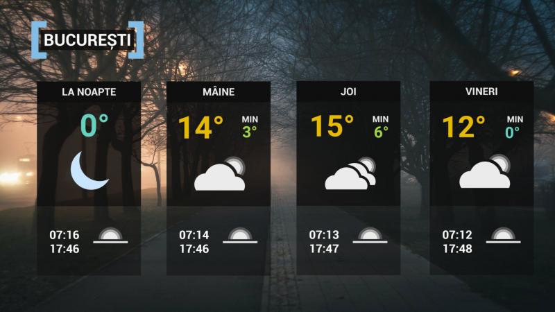 La noapte, cerul va fi mai mult senin, iar vântul va sufla slab. Temperatura minimă va fi de -2...0 grade. Vor fi condiţii de ceaţă.