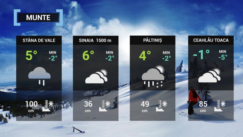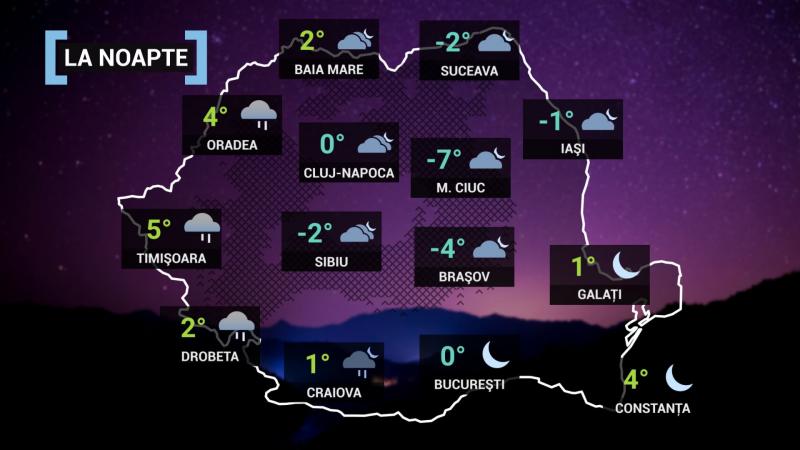 Cerul va fi variabil, cu înnorări persistente în masivele vestice şi nordice, iar local şi temporar în prima parte a intervalului se vor semnala precipitaţii mixte, iar la altitudini mari va ninge. Vântul va sufla slab şi moderat, cu intensificări îndeosebi din a doua parte a nopţii în zona înaltă a Carpaţilor Orientali şi în Munţii Apuseni, cu viteze la rafală de peste 80 km/h, spulberând zăpada şi determinând scăderea semnificativă a vizibilităţii. Temperaturile vor fi comparabile cu cele din ziua precedentă.
