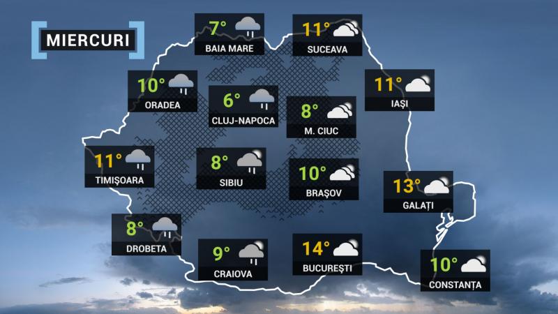 La noapte, în regiunile vestice, sud-vestice şi parţial în cele centrale cerul va fi mai mult noros, iar pe arii în general restrânse, temporar vor fi precipitaţii slabe, sub formă de ploaie în zonele joase de relief şi mixte în zona montană aferentă.