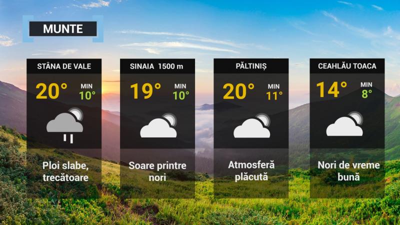 Pe parcursul zilei cerul va fi variabil şi doar pe arii restrânse se vor semnala ploi de scurtă durată. Seara şi noaptea, înnorările se vor accentua şi local vor fi averse însoţite de descărcări electrice. Cantităţile de apă vor depăşi 15...20 l/mp, mai ales în Munţii Apuseni şi în nordul Carpaţilor Orientali. Vântul va sufla slab şi moderat, cu intensificări de scurtă durată asociate ploilor. Valorile termice vor scădea uşor în Carpaţii Occidentali, iar în rest nu vor varia semnificativ faţă de ziua precedentă.