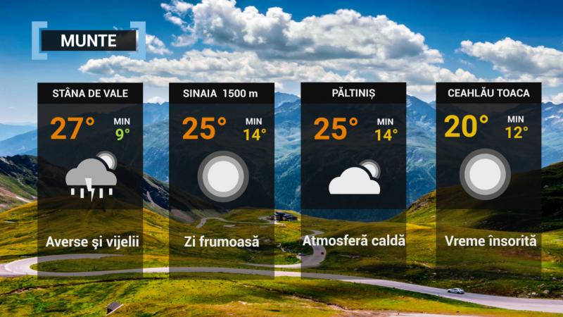 Vremea va fi caldă. Cerul va fi variabil, cu înnorãri temporare mai ales după-amiaza şi noaptea în Carpaţii Occidentali şi în vestul celor Meridionali, unde local vor fi averse ce vor avea şi caracter torenţial, descărcări electrice şi, posibil, vijelii şi grindinã. În restul masivelor, astfel de fenomene se vor semnala pe arii mai restrânse, cu o probabilitate mai mare în nordul Carpaţilor Orientali. Vântul va avea unele intensificãri pe creste. Valorile termice vor fi comparabile cu cele din intervalul anterior.