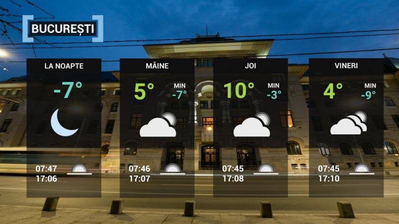 În timpul zilei, vremea va fi apropiată de normal din punct de vedere termic în majoritatea zonelor, însã noaptea va fi rece, local geroasă în centru, vest, nord-vest şi în dealurile din sudul ţării. Astfel, temperaturile maxime se vor încadra între -4 şi 6 grade, iar cele minime între -15 şi -3 grade, uşor mai ridicate pe litoral.