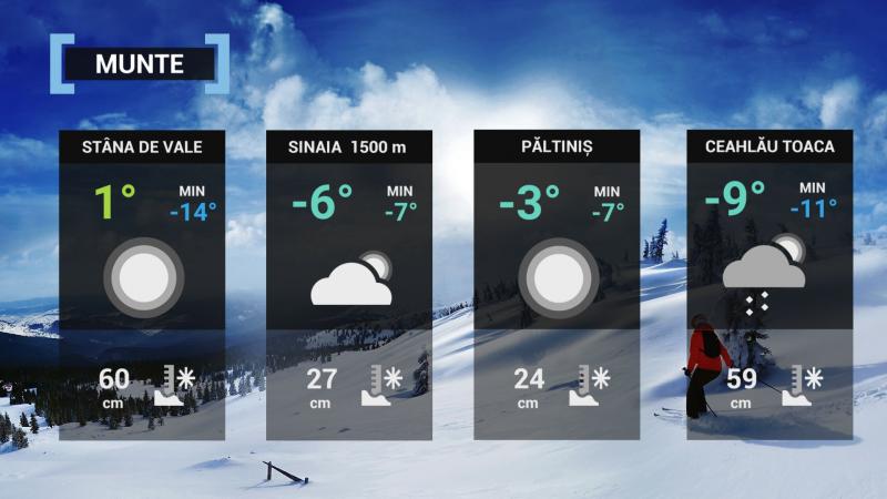 Vremea va fi în general frumoasă, cu valori termice apropiate de cele normale la această dată. Cerul va fi variabil şi vântul va sufla slab şi moderat. Temperatura maximă se va situa în jurul a 4 grade, iar cea minimă va fi de -7...-4 grade. Spre sfârşitul nopţii vor fi condiţii de ceaţă. Presiunea atmosferică va scadea la o valoare uşor superioară celei normale.