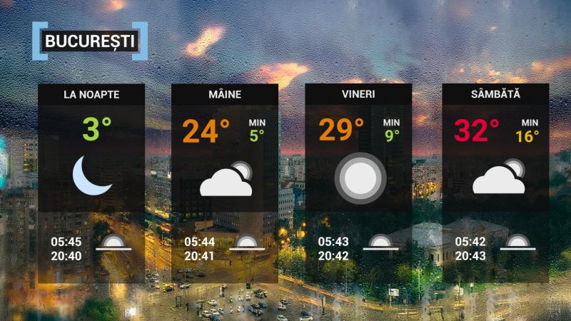 La noapte, vremea va fi rece în toate regiunile, iar cerul va deveni mai mult senin. Vântul va sufla slab şi moderat, cu unele intensificări pe crestele Carpaţilor Meridionali, unde rafalele vor depăşi 60...70 km/h, iar cu viteze mai mici şi pe arii restrânse şi în Moldova, Dobrogea şi Bărăgan. Temperaturile minime vor fi cuprinse între 0 şi 10 grade, mai scăzute, până în jurul a -2 grade, în depresiunile din estul Transilvaniei unde se va produce brumă. Pe alocuri vor fi condiţii de ceaţă.