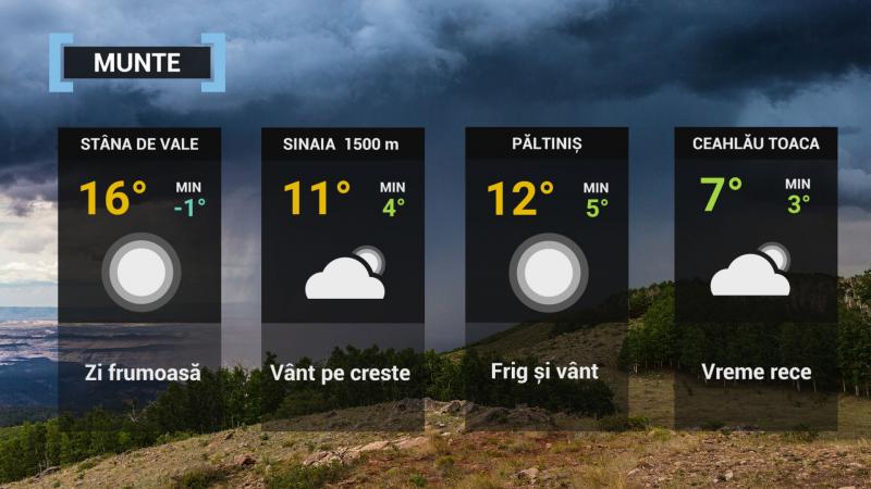 Valorile termice, în creştere faţă de intervalul anterior, vor caracteriza totuşi o vreme rece dimineaţa şi noaptea. Cerul va fi variabil, iar vântul va sufla slab şi moderat, cu unele intensificări pe creste.