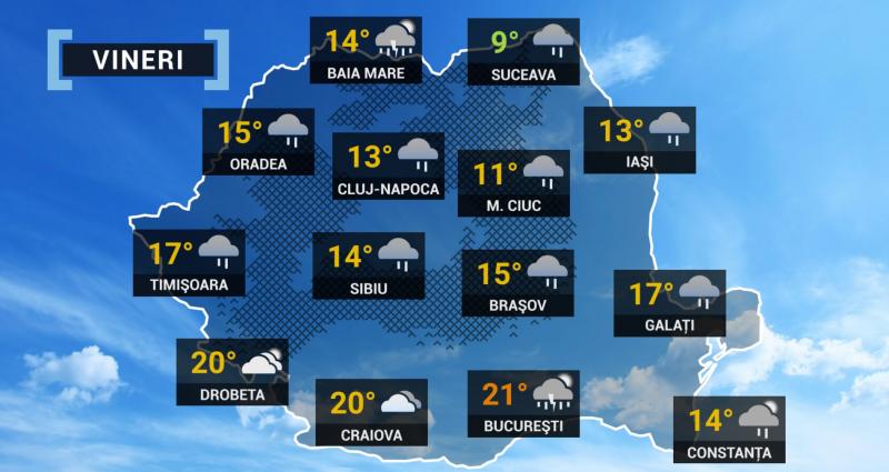 Vremea se va răci în vestul, nordul şi centrul ţării, iar în rest se va menţine caldă pentru această dată. Instabilitatea atmosferică se va manifesta prin înnorări temporar accentuate şi ploi mai ales sub formă de aversă, însoţite şi de descărcări electrice, în Maramureş, Transilvania, Moldova, iar după-amiaza şi seara şi în Muntenia şi Dobrogea.