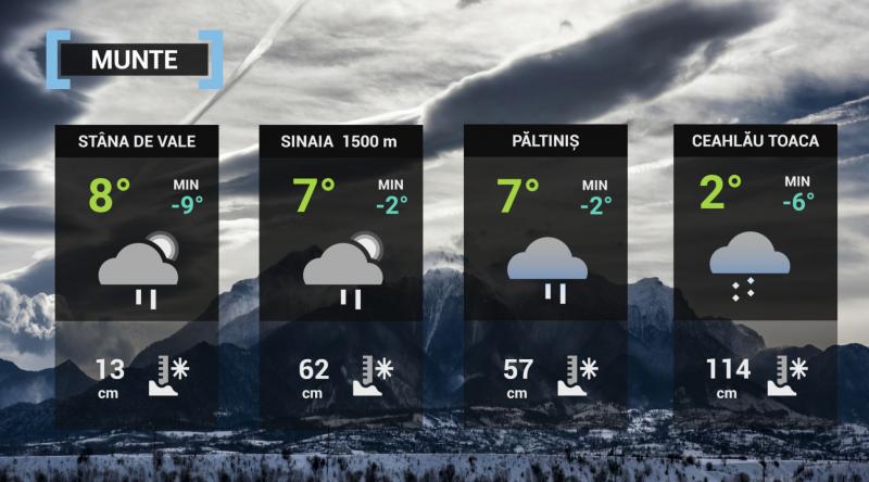 În celelalte regiuni, ploile se vor semnala pe arii mai restrânse. Vor fi condiţii de grindină, iar izolat cantităţile de apă vor depăşi 15...20 l/mp. În zona montană înaltă, trăcător, vor fi precipitaţii mixte. Noaptea, cerul va fi variabil, cu înnorări în sud-est şi centru, unde numai pe alocuri vor mai fi precipitaţii slabe, ploi în zonele joase de relief, iar la munte ninsori şi lapoviţă. Vântul va prezenta intensificări în majoritatea regiunilor, în general cu viteze de 45...55 km/h, iar în zona înaltă a Carpaţilor Meridionali, rafalele vor depăşi temporar 70...80 km/h.