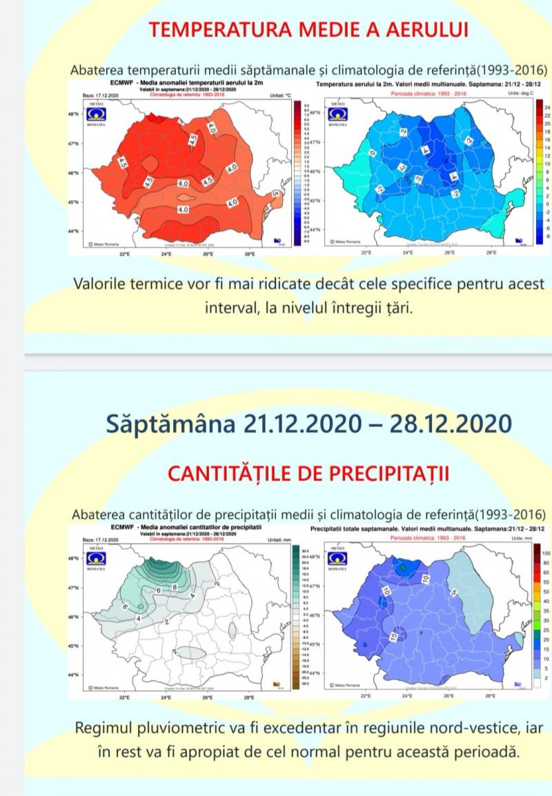 În perioada 21 – 28 decembrie, valorile termice vor fi mai ridicate decât cele specifice pentru acest interval, la nivelul întregii țări. Regimul pluviometric va fi excedentar în regiunile nord-vestice, iar în rest va fi apropiat de cel normal pentru această perioadă.