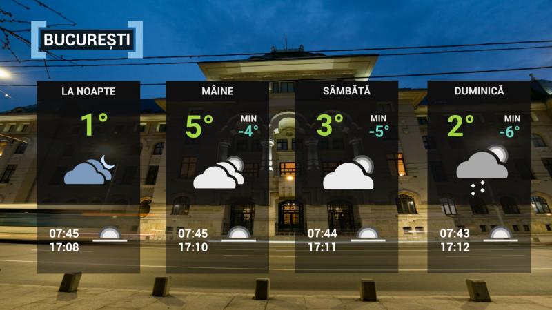 La noapte, cerul va fi temporar noros, dar condiţiile de precipitaţii vor fi reduse. Vântul va sufla moderat. Temperatura minimă va fi de -2...1 grade.