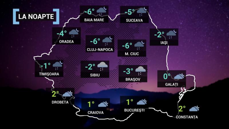La noapte, cerul va avea înnorări în majoritatea regiunilor şi vor fi precipitaţii predominant sub formă de ninsoare în vestul, nordul, centrul ţării şi izolat în restul teritoriului. Vor fi condiţii de polei. La munte va ninge, iar la altitudini de peste 1600 m, vântul va avea intensificări, cu rafale ce vor depãşi 80...100 km/h, va fi viscol, vizibilitatea redusă şi zăpada troienită.