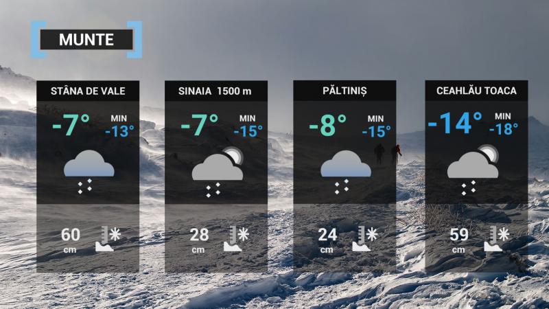În restul ţării înnorările vor fi temporare şi precipitaţiile izolate, ninsori, iar în special în sud-est, mixte. Vântul va avea intensificări la munte, unde în special la altitudini mari vitezele vor depăşi 80...100 km/h, vizibilitatea va fi redusă şi zăpada troienită, iar în zonele joase de relief vântul va sufla slab şi moderat, pe alocuri cu intensificări, în special în nordul Moldovei, în Oltenia şi sud-vestul Munteniei, la viteze în general de 45...55 km/h.