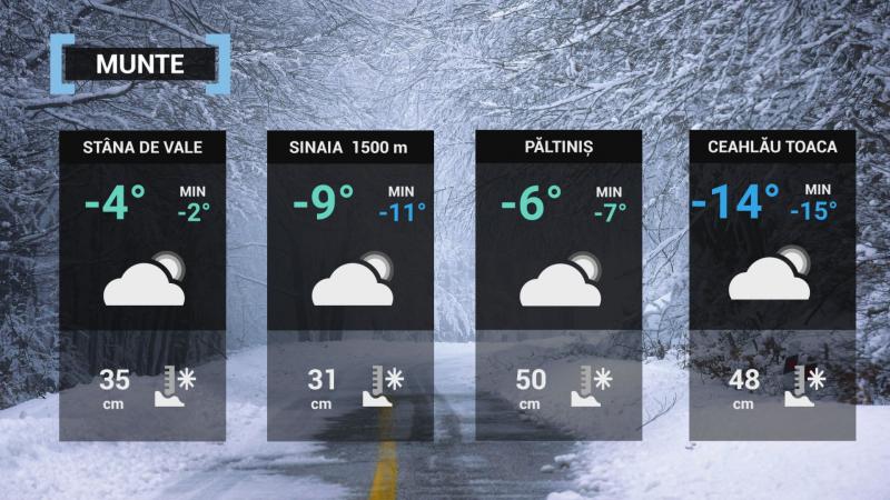 Vremea va fi rece, geroasă mai ales dimineaţa, dar la altitudini mari în cea mai mare parte a intervalului. Ziua, cerul va fi variabil, dar noaptea, aria de nebulozitate se va extinde, cuprinzând treptat toate masivele. Va ninge în general slab, pe arii mai extinse în Carpaţii Orientali şi Occidentali şi pe alocuri în restul zonei montane. Vântul va sufla slab şi moderat, cu unele intensificări noaptea la altitudini mari, în special în Munţii Apuseni şi în nordul Carpaţilor Orientali.