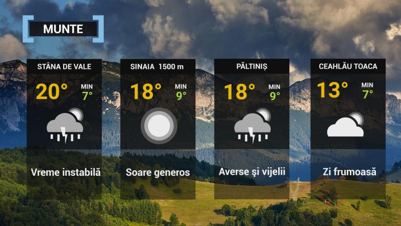 Vremea va fi în general frumoasă şi normală din punct de vedere termic. Cerul va fi variabil, cu înnorări temporare după-amiaza şi seara, iar pe arii restrânse în zona de munte şi izolat în restul teritoriului, se vor semnala ploi de scurtă durată şi, posibil, descărcări electrice. Vântul va sufla slab şi moderat, cu uşoare intensificări pe litoral. Temperaturile maxime se vor situa între 23 şi 32 de grade, cu cele mai ridicate valori în sudul Olteniei, iar cele minime vor fi cuprinse între 9 grade în depresiuni şi 20 de grade în nordul litoralului. Presiunea atmosferică va fi asemănătoare celei de cu o zi înainte - de regim slab anticiclonic, valori mai joase decât în alte regiuni urmând a fi în sud-est şi în sud.