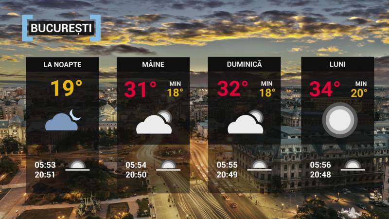 Vremea se va menţine în general frumoasă şi normală din punct de vedere termic. Cerul va fi variabil, cu înnorări temporare îndeosebi după-amiaza şi seara, când în zona de munte, în dealurile Olteniei şi Munteniei şi în Transilvania, pe arii restrânse, vor fi averse însoţite de descărcări electrice. Vântul va sufla slab şi moderat, cu intensificãri de scurtã duratã în timpul ploilor. Temperaturile maxime vor fi cuprinse între 25 şi 32 de grade, iar cele minime se vor încadra între 12 şi 19 grade, cu valori mai scãzute în depresiunile Carpaţilor Orientali spre 8 grade, dar şi mai ridicate pe litoral pânã la 21...22 de grade. Dimineaţa şi noaptea, izolat vor fi condiţii de ceaţă. Presiunea atmosferică va avea variaţii nesemnificative.