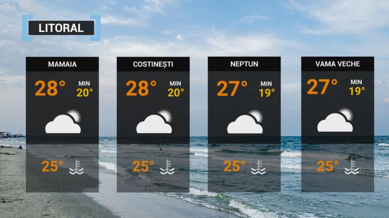 Vremea va fi în general frumoasă şi normală termic pentru această dată. Cerul va fi variabil, iar vântul va sufla slab şi moderat. Temperaturile maxime se vor încadra între 26 şi 29 de grade, iar cele minime între 18 şi 22 de grade. Temperatura apei mării va avea valori cuprinse între 23 şi 26 de grade.